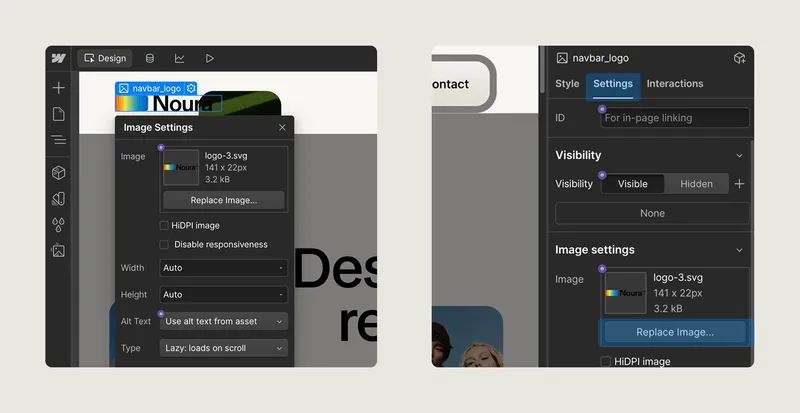To update the logo, double-click the Navbar component to open it for editing. Once inside, you can double-click the logo image to select a new one. Or you can just click once on the logo and use the right panel to upload your own logo file. For best results, use an optimized SVG or PNG with a transparent background.